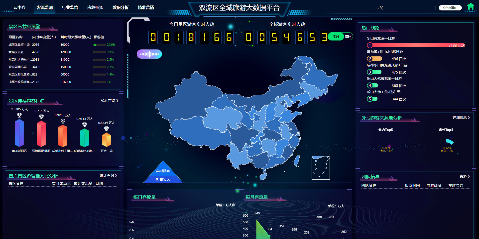 双流区文体旅局 项目概述依托成都旅游大数据中心核心框架体系,紧紧围绕大数据国家战略在成都旅游全域化发展中的创新实践和落地实施,进一步完成各级旅游信息化管理部门数据整合、系统整合和标准化建设要求,发展成都旅游大数据全域化管理,以旅游业为优势产业,统一规划布局、优化公共服务、推进产业融合、加强综合管理、实施系统营销,不断提升旅游业现代化、集约化、品质化、国际化水平,更好满足旅游消费需求。建设内容整体逻辑架构:部分功能模块展示: